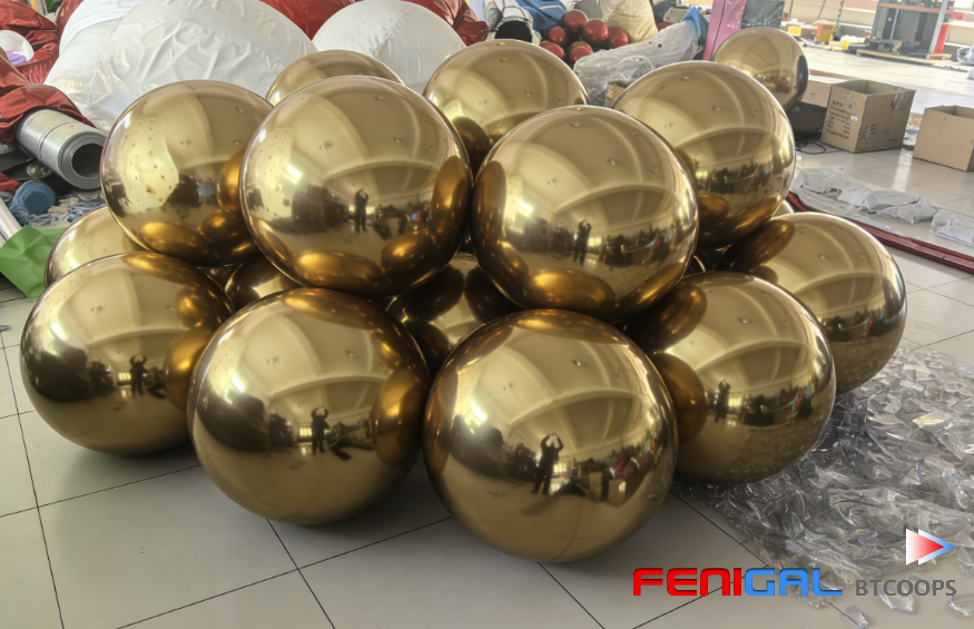Elegant gold-finish inflatable mirror sphere, perfect for high-end weddings, gala dinners, and VIP parties where sophistication and photogenic appeal are essential. Unlike traditional disco balls, this lightweight, shatterproof design offers a modern twist on classic glamour—ideal for venues that prioritize safety without sacrificing style.